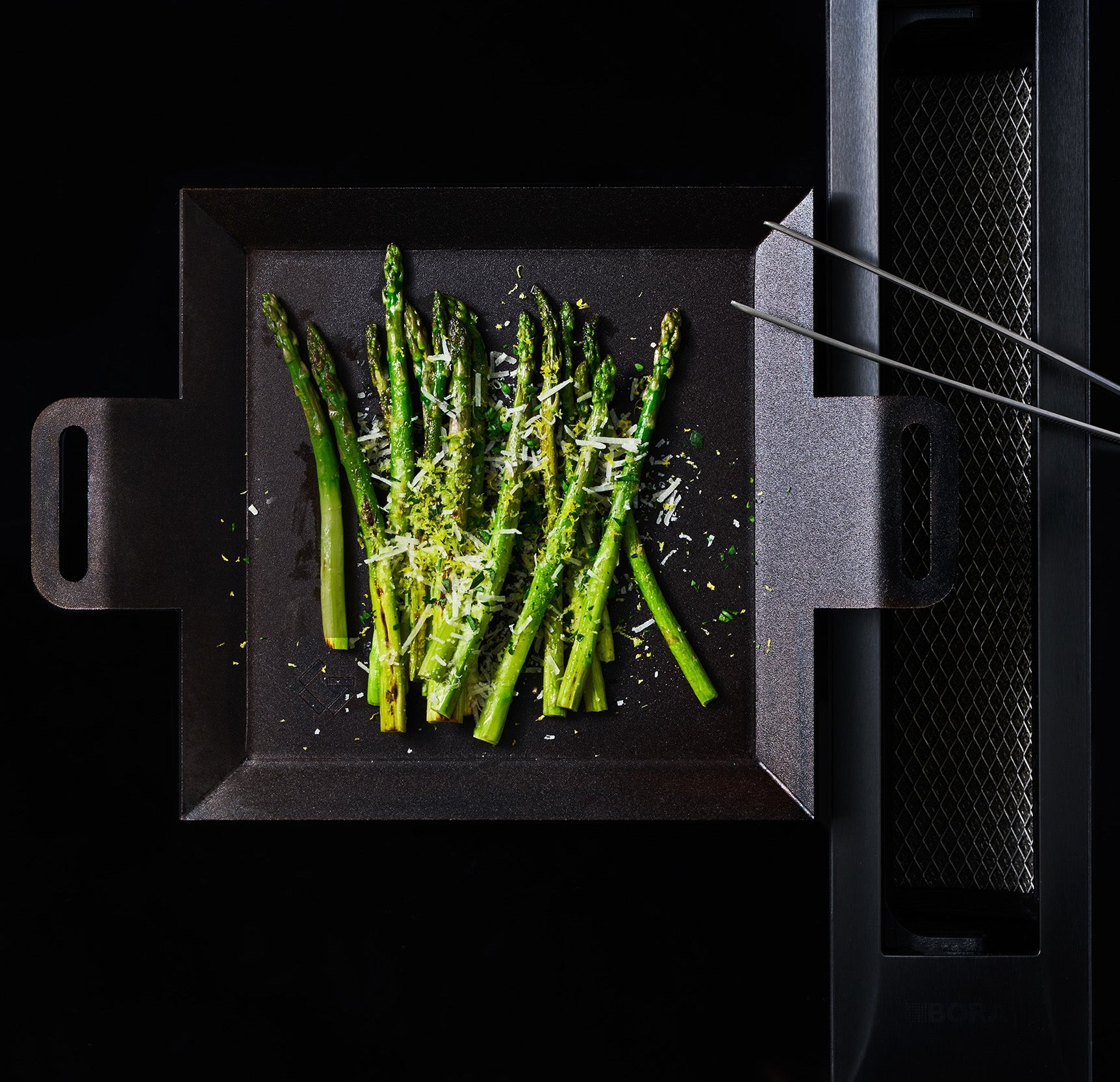 This means you achieve a deeper and more intense flavor from everything from steaks to grilled asparagus. The raised handles provide increased comfort when lifting the griddle and smasher from the induction stove to the grill, the fire - or directly to the serving table.