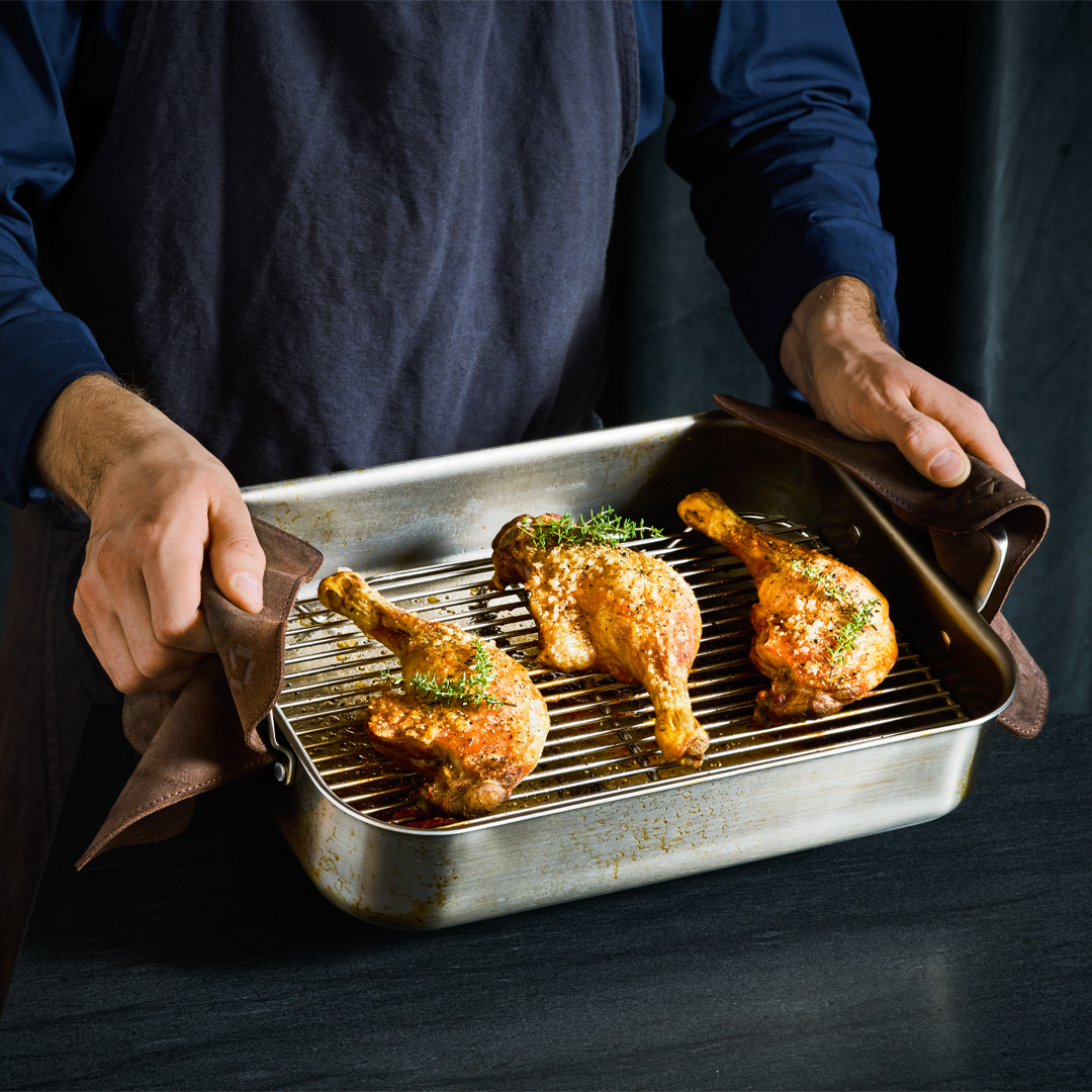 The handles are specially designed to provide a comfortable, ergonomic grip for easier handling, even when managing a piping-hot roasting pan. With its generous capacity, the roasting pan is perfect for cooking a whole duck or roast. And if you purchase the rack that fits perfectly inside, any juices collect at the bottom, ready to form the base of a delicious sauce.