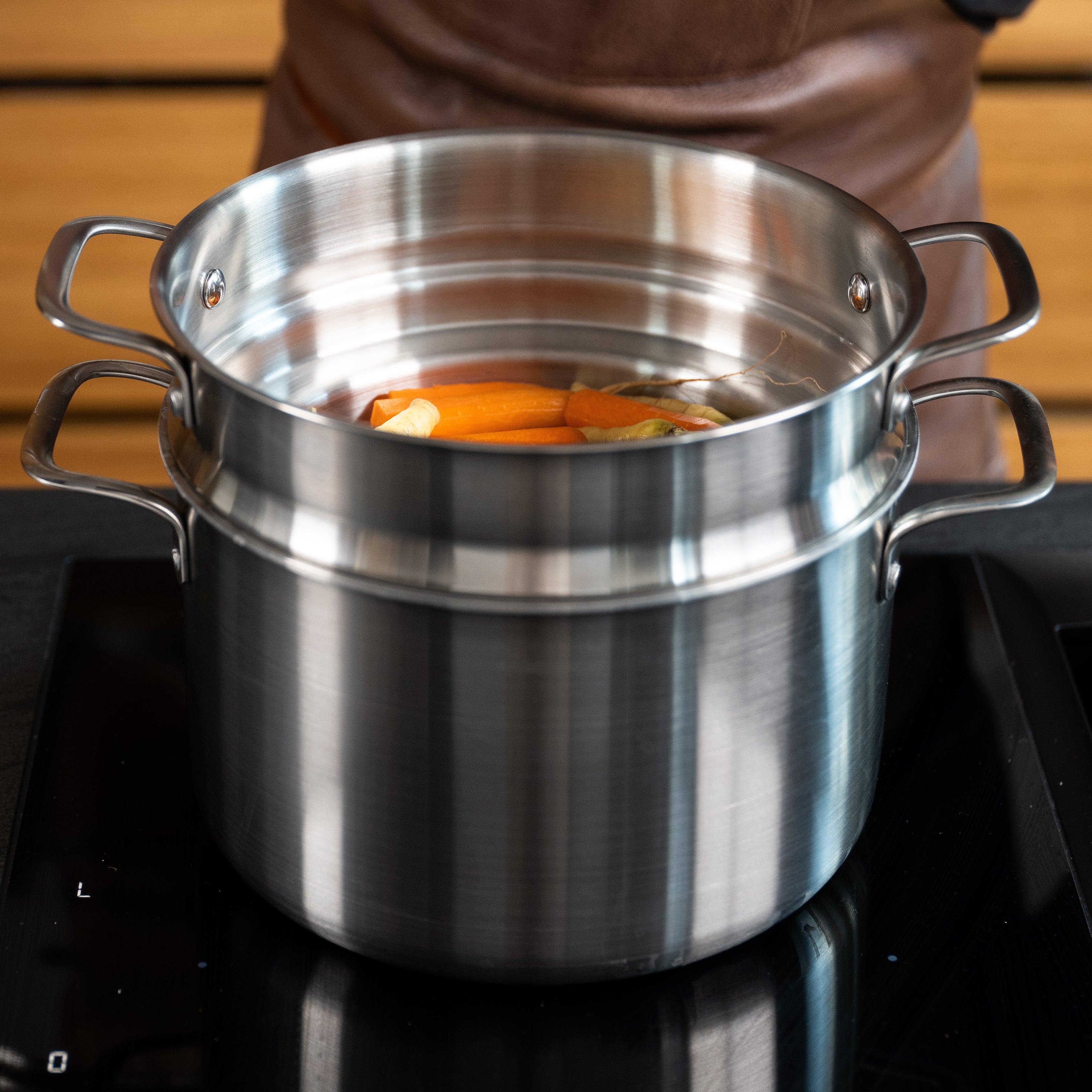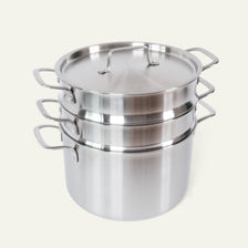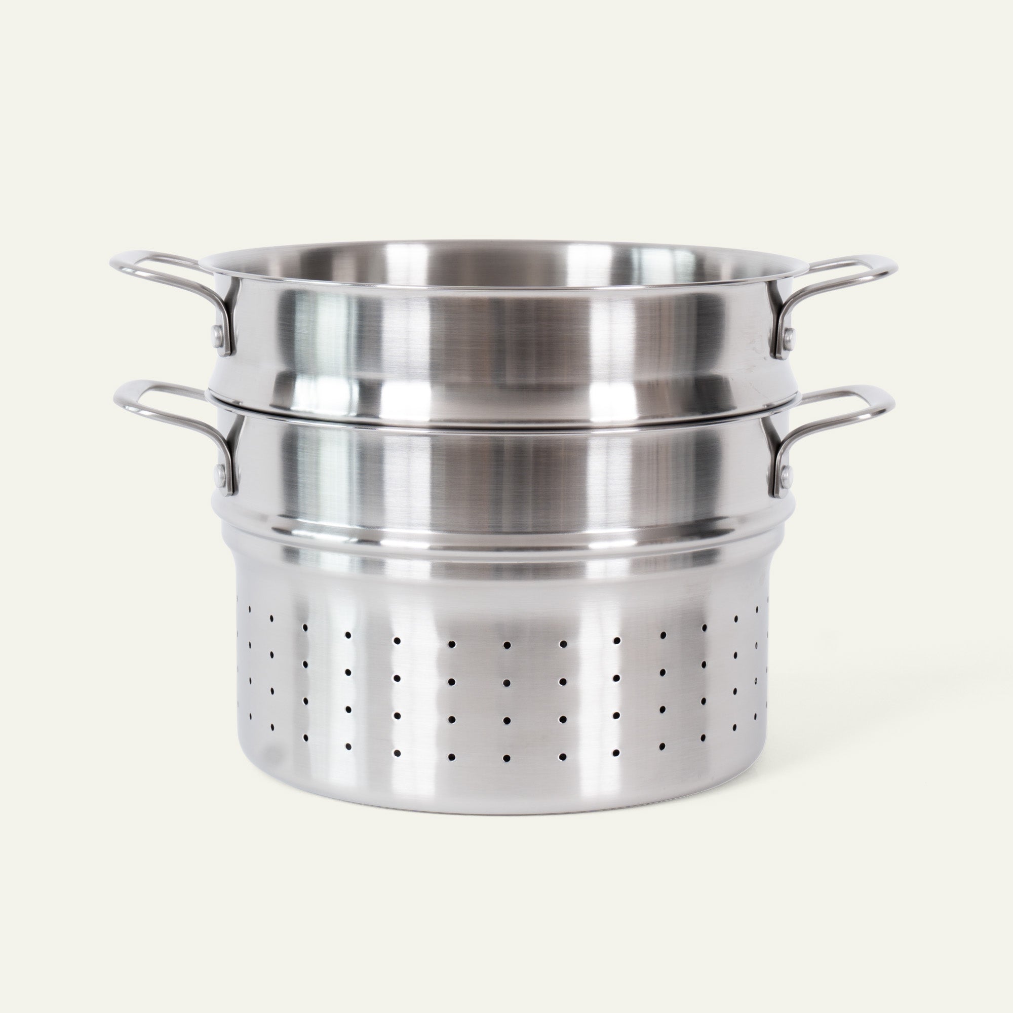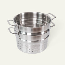 A pasta and steaming insert is the ideal upgrade for your 5-ply pot. The sturdy handles on the inserts make it easy to lower them into boiling water or a steaming pot without burning yourself, and just as easy to lift them out when the food is ready. And if you need to rinse the contents in cold water to stop cooking, you can easily lift the insert over the cold tap. Both inserts are made in Italy by the same family-run company that makes our 5-ply cookware.